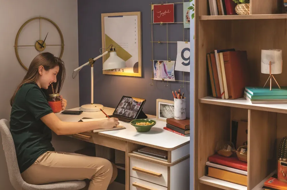 Raf ve ünitelerin masanın hemen arkasında değil yan tarafında bulunması, öğrencinin dikkat alanını sade tutarak verimi artırıyor.